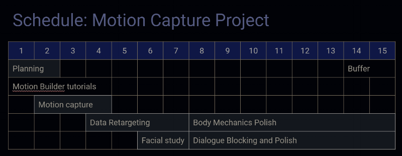 By using Carnegie Mellon's on-campus motion capture studio and cooperation with an actor through the School of Drama, my goal is to have a polished 20-30 second acting piece for my demo reel at the end of the semester with motion capture for body, and hand-keyed animation for the face and hands. After some advice from faculty mentors Ricardo Washington and Ruth Comley, I decided that I would not choose the scene to be acted out. Rather, I would present a selection of scenes, and let the student I worked with decide the scene they would like to try. It would also be good professional practice for me in that regard, and would hopefully allow the actor to put more of themselves into the data capture sessions.